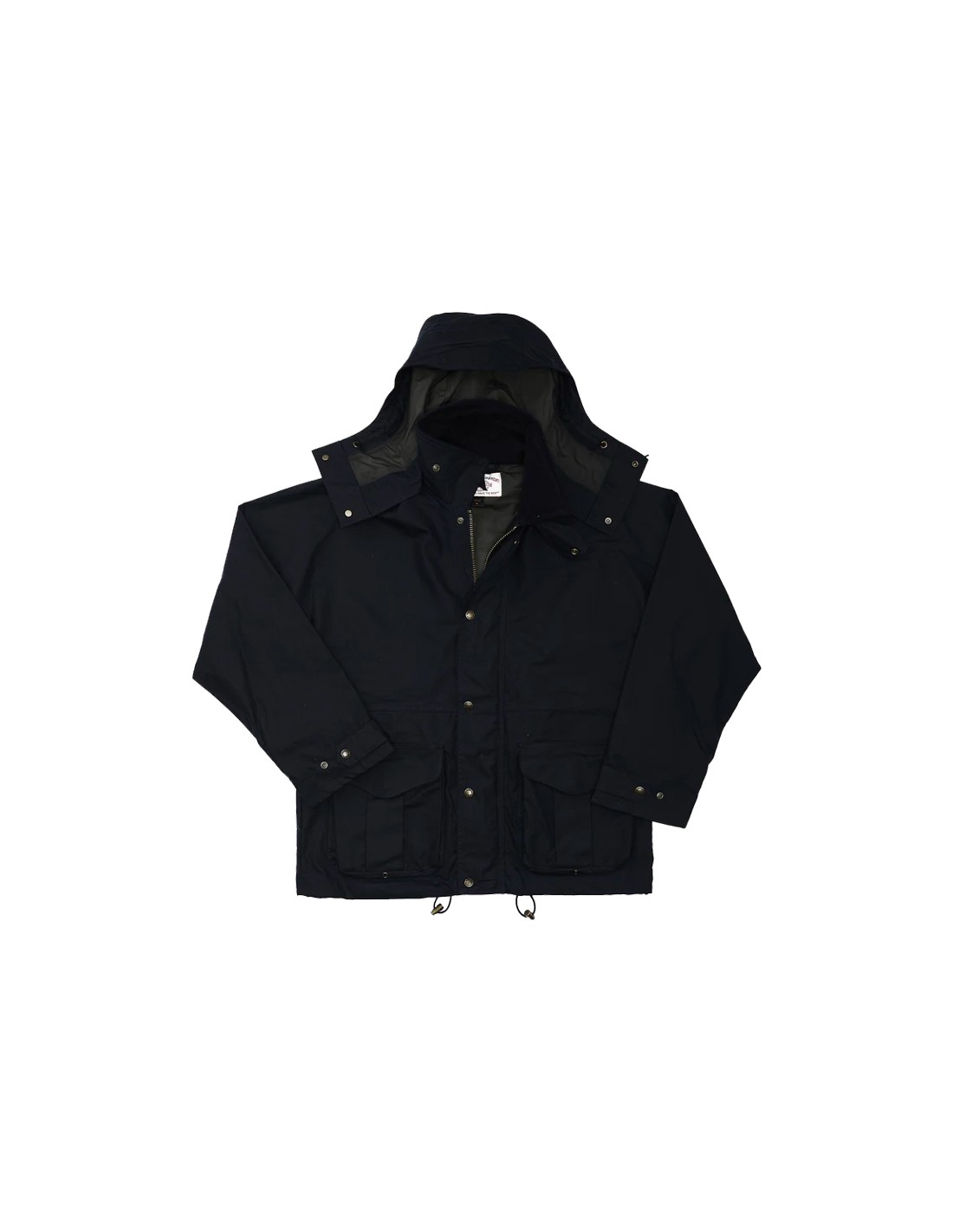 A dry-finish cover fabric liner adds a layer of protection between you and the waxed cotton hull . The two-way front zipper is protected by a snap-closure storm flap to keep wind and water out. Suede cotton moleskin from Brisbane Moss in England lines the collar and outer surface inside the hand pockets. Sleeve cuffs are snap-adjustable and feature a rib-knit inner cuff to seal out the cold. The waist and hem are adjustable by drawcord, as is the included detachable hood.