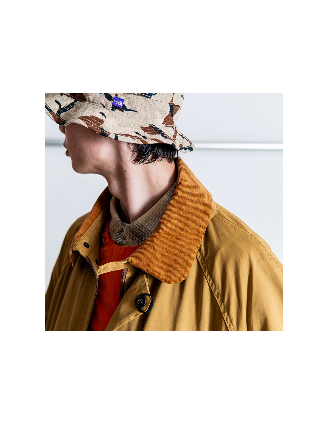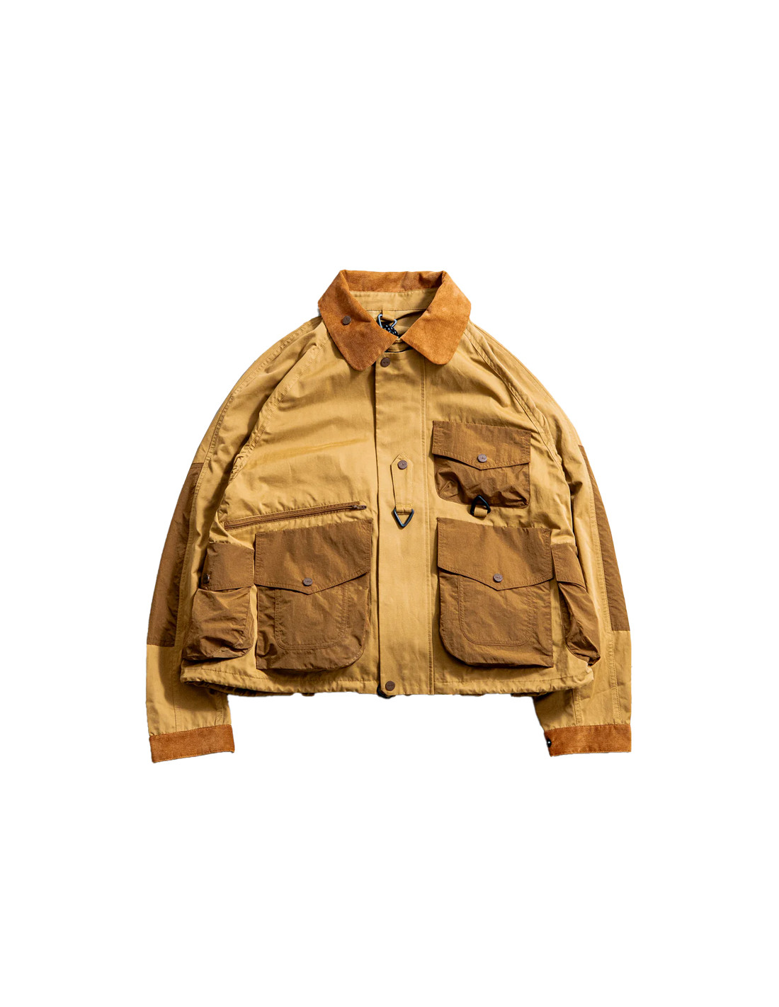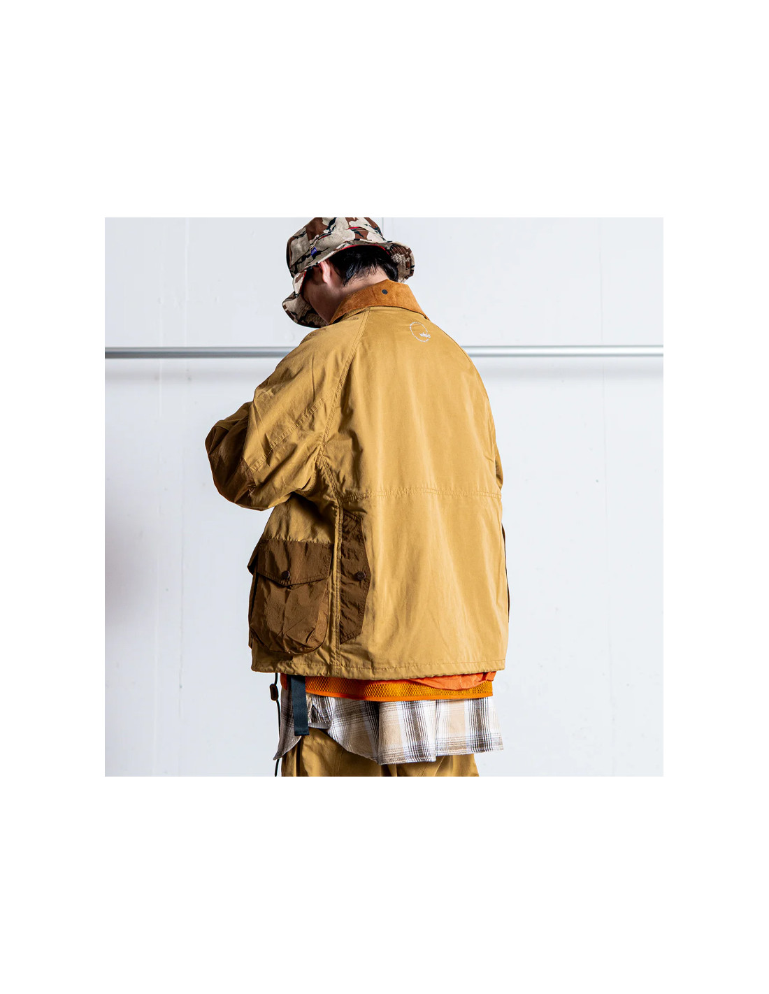 This short jumpsuit reinterprets the functional design of a classic hunting jacket by combining it with modern water-repellent materials.