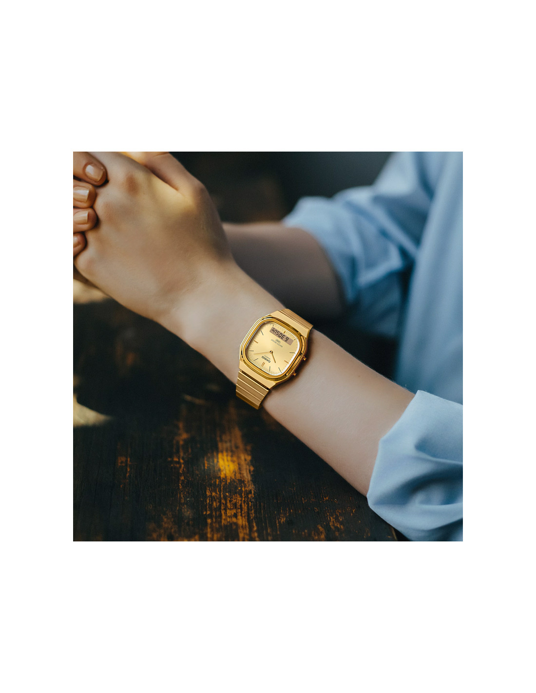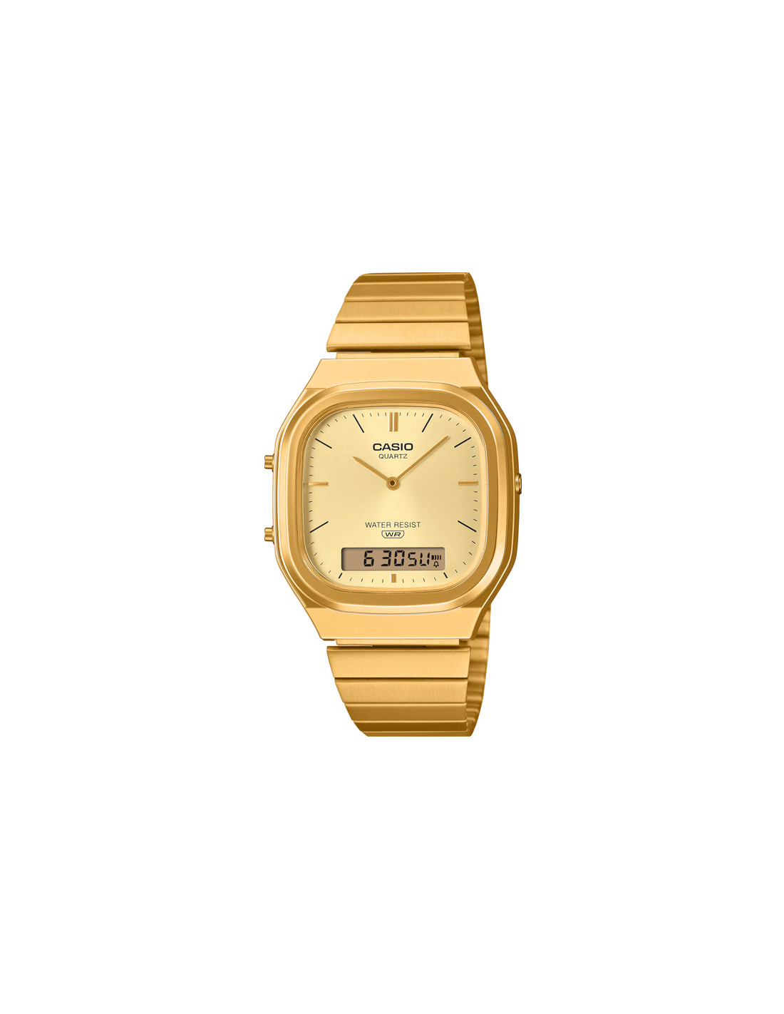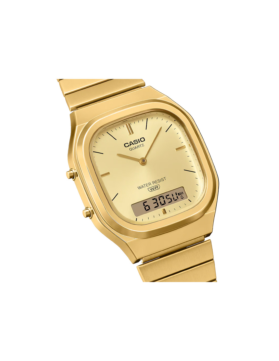 With its dual analog and digital display, the AQ-240 boasts a retro yet modern design. Its slightly rectangular dial, balanced by a gently rounded case and metallic curves, exudes sophistication.