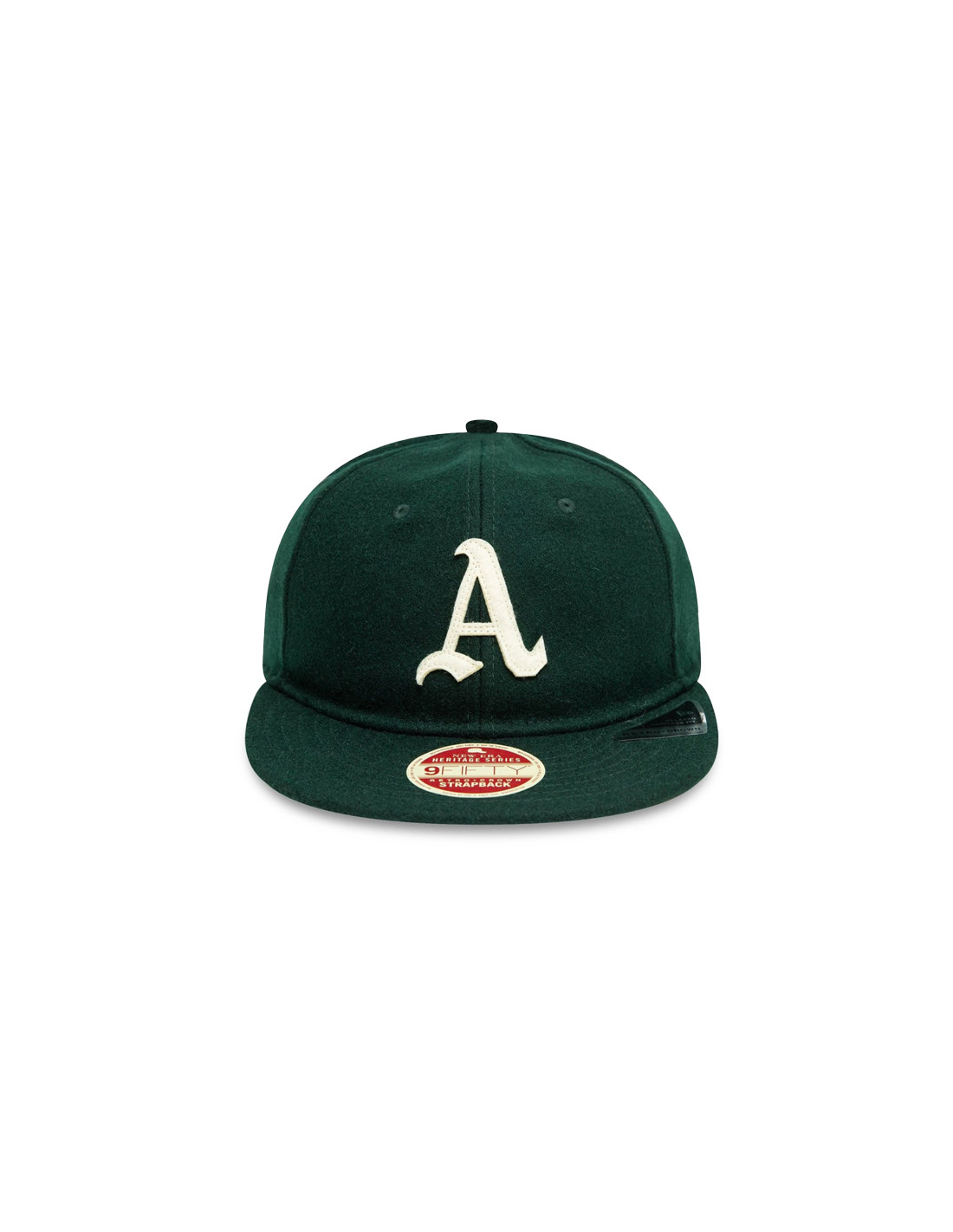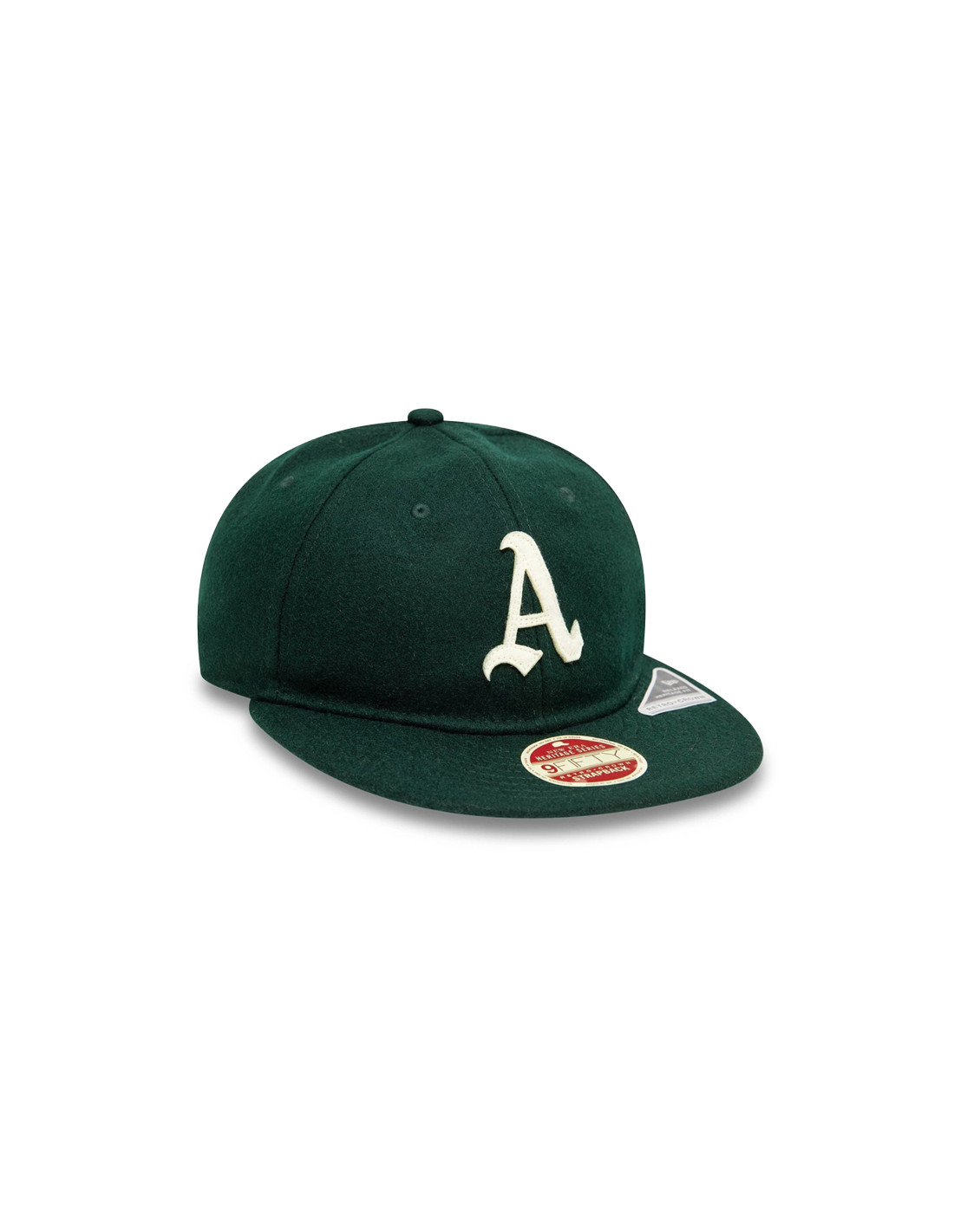 This New Era 9FIFTY RC Oakland Athletics cap from the MLB Heritage Series features a stylish design. Made from high-quality wool, it has the Athletics' retro logo embroidered on the front panels, an adjustable matching wool sweatband, a green lower visor, and the New Era flag embroidered on the left side.