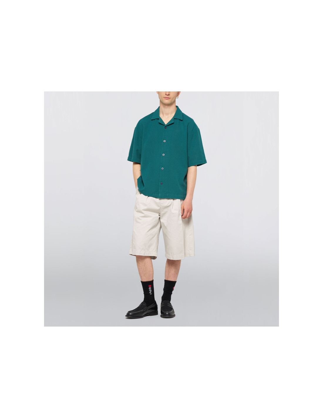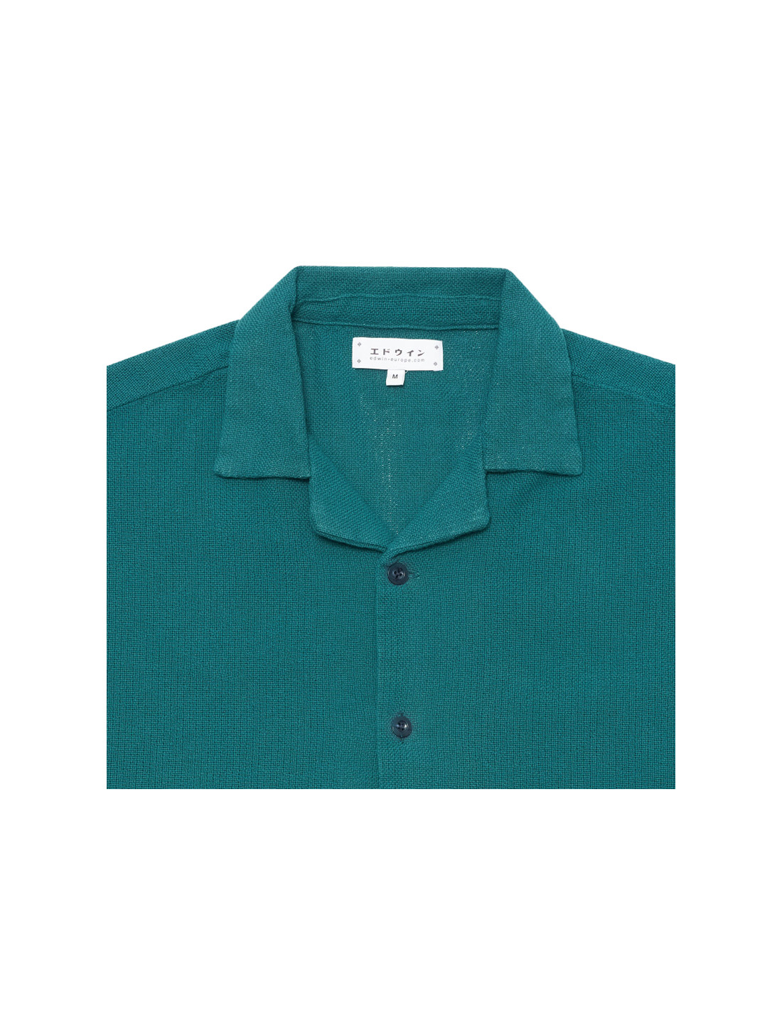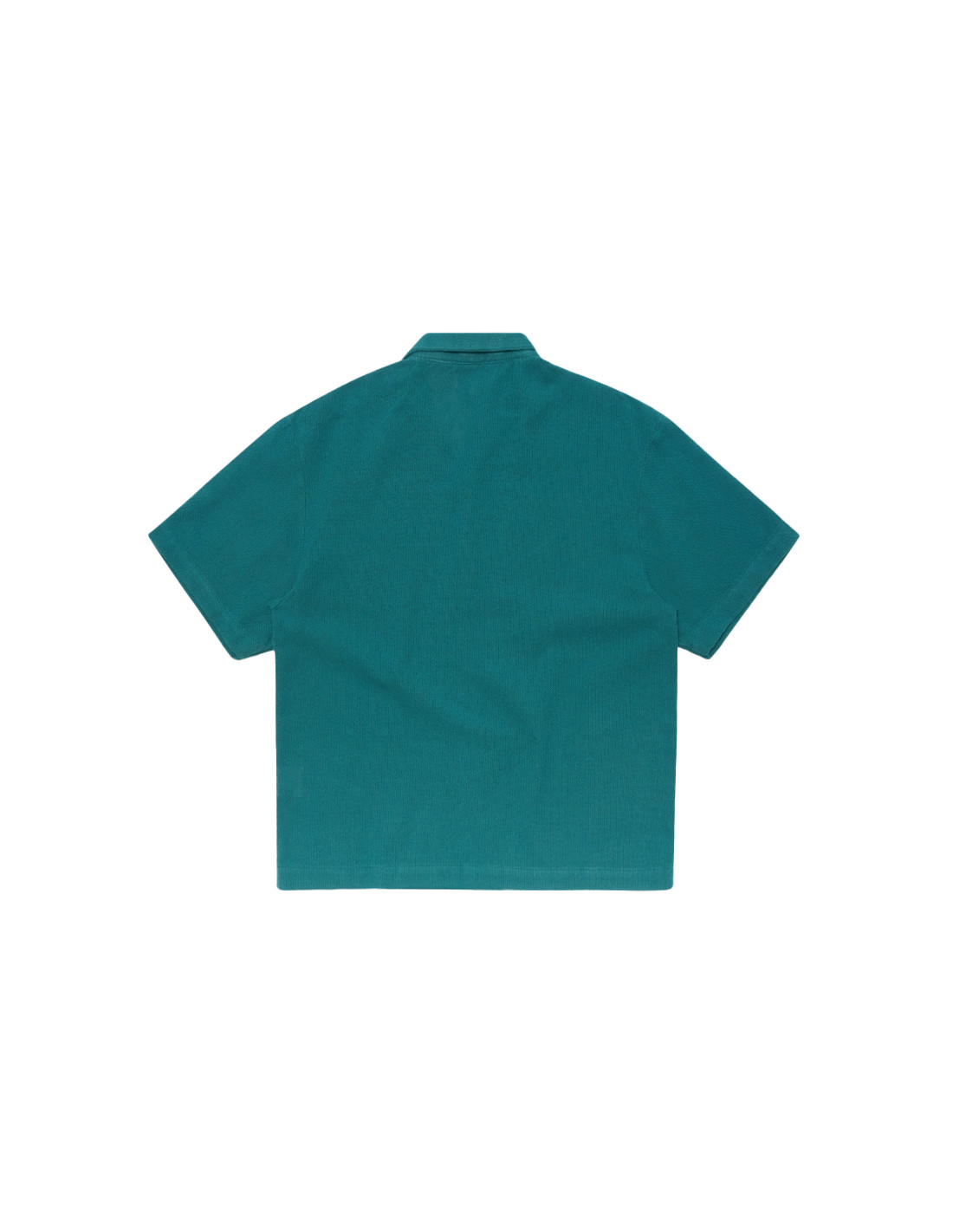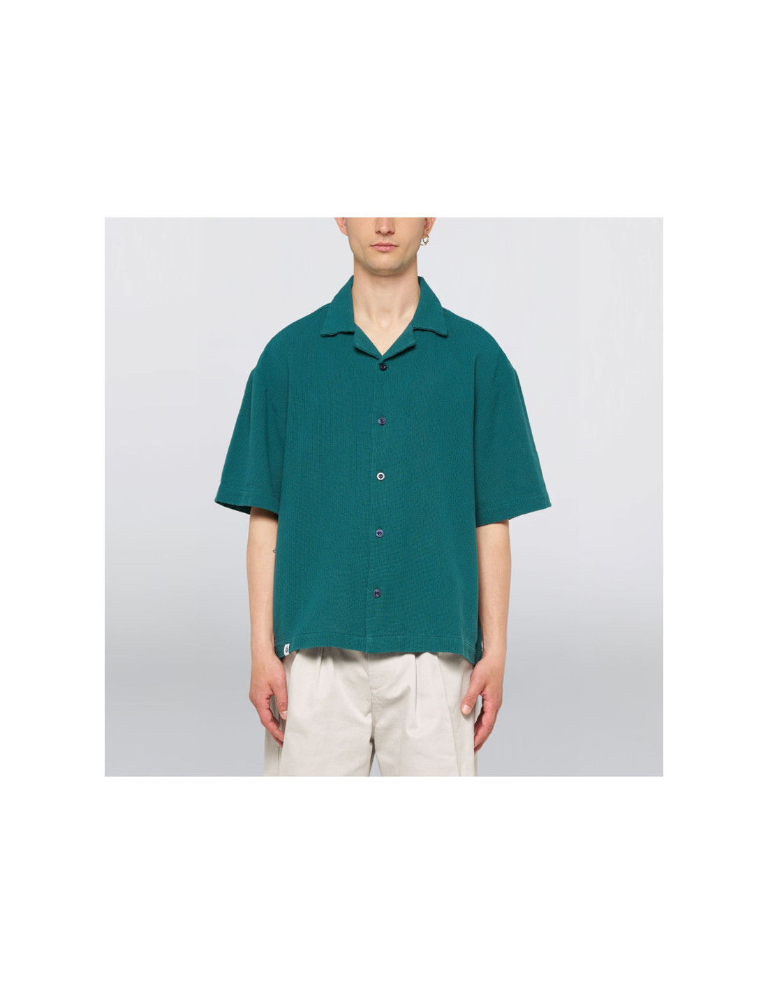 The Saga Shirt SS, a premium piece for the warmer season, is crafted from a heavyweight 220 g/m² open-weave pure cotton fabric. This textured knit offers a relaxed drape and excellent breathability, presented in a rich Mediterranea hue. It's tailored in a comfortable relaxed fit and features a vintage-inspired open collar, subtly finished with the signature Beetle label near the bottom hem.
