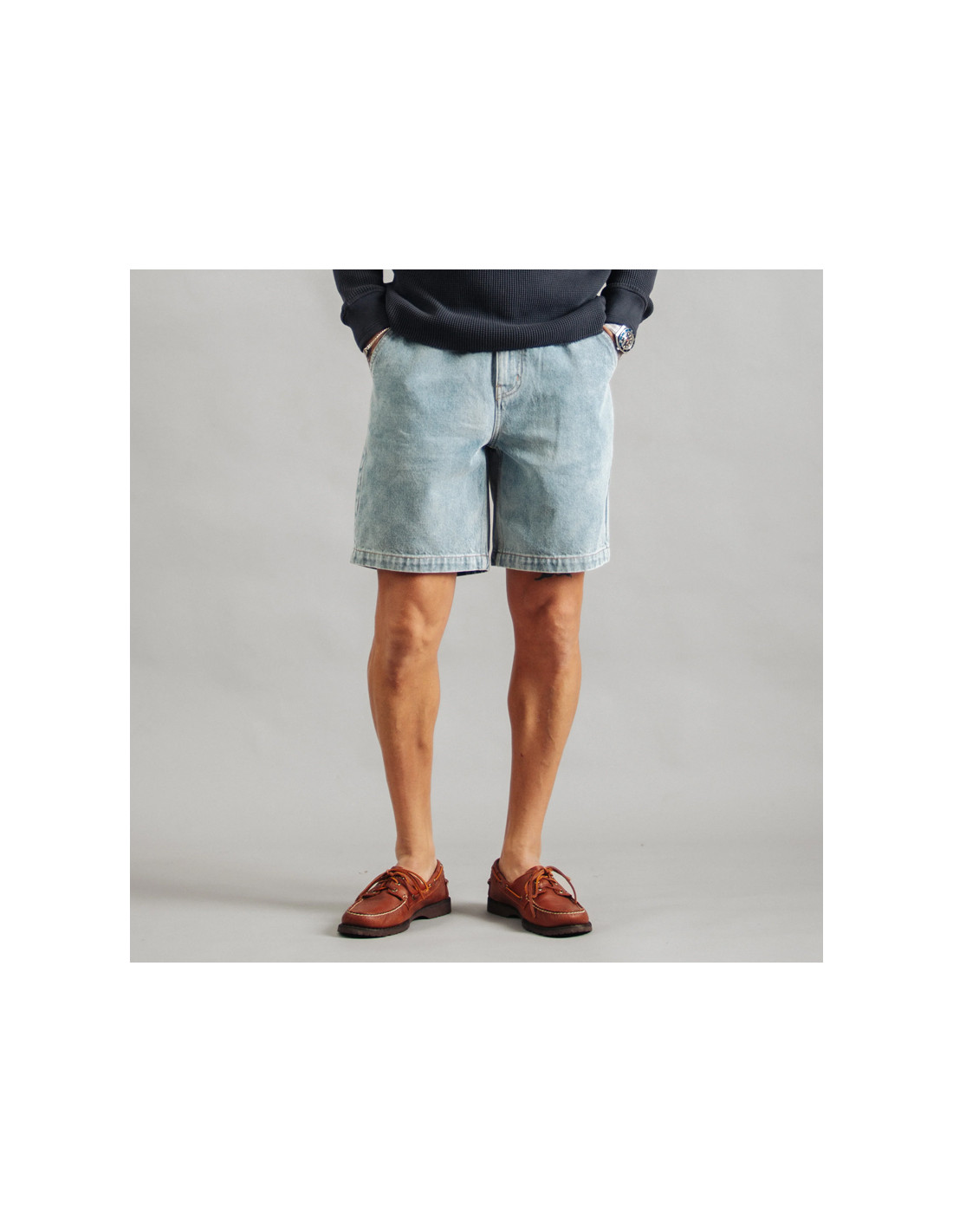 These denim shorts with patch pockets live up to their description. The 340 g/m² (12 oz) raw denim, pre-washed once, and vintage riveted buttons give them an authentic workwear feel, while the belt loops allow you to add a touch of elegance if you wish.