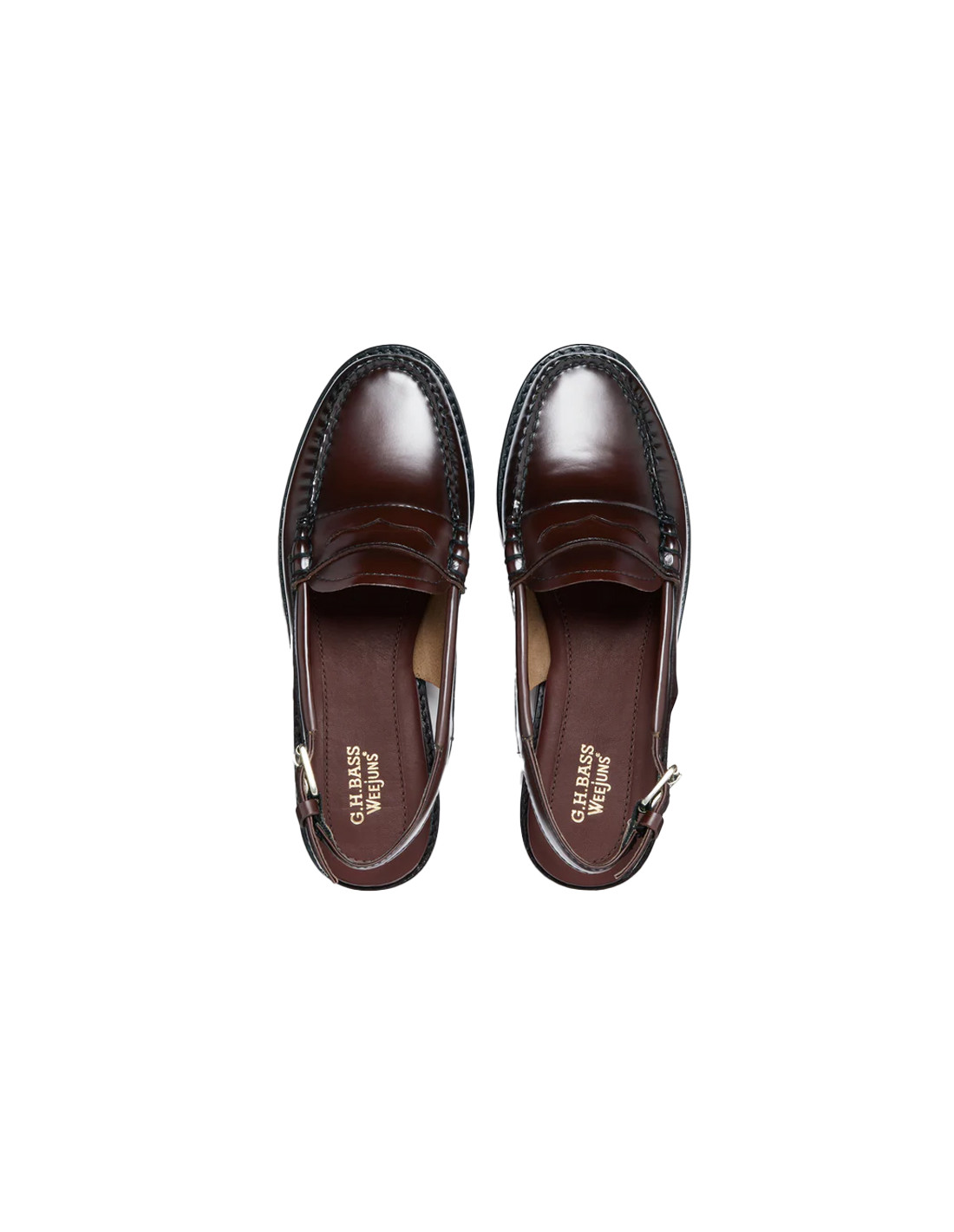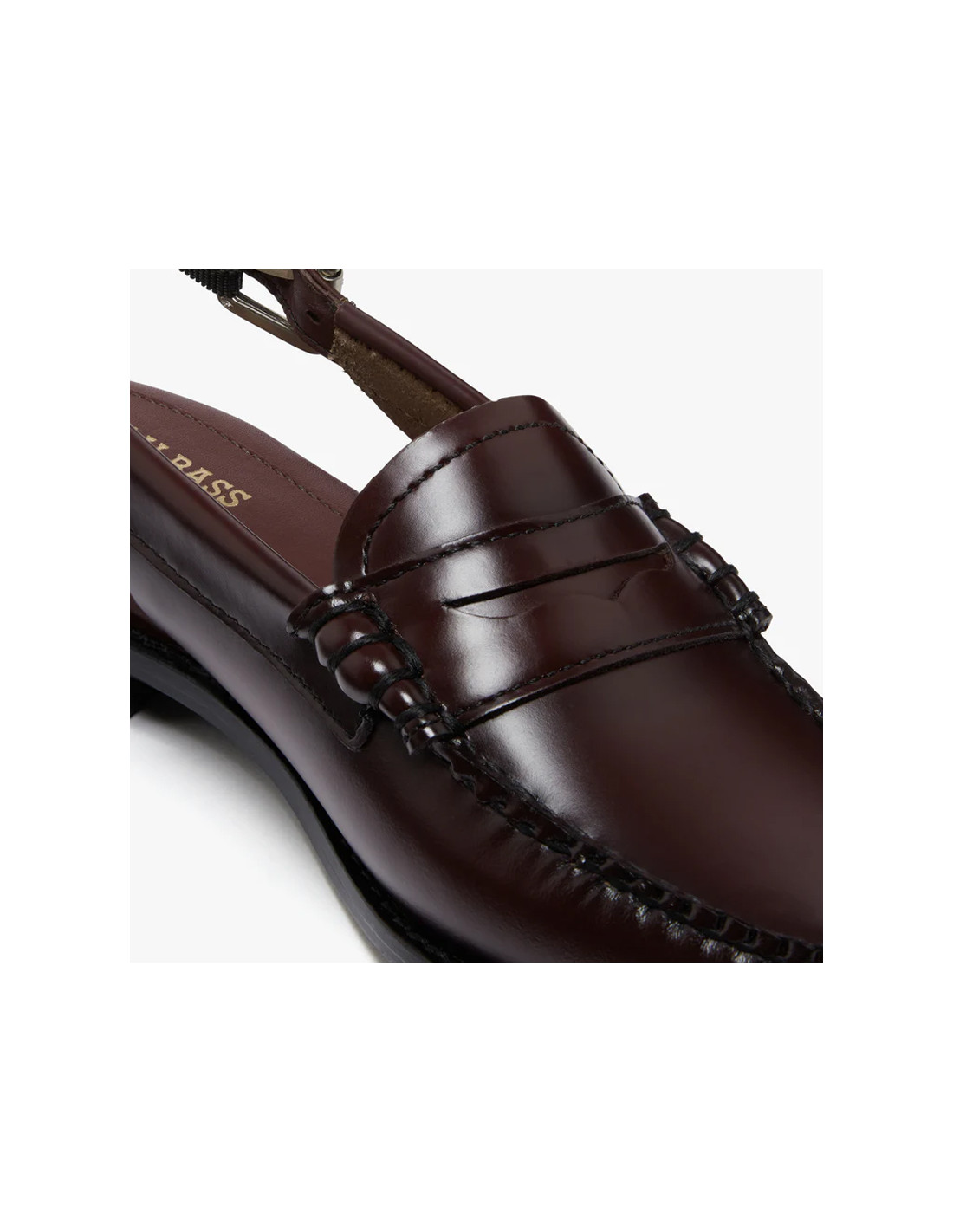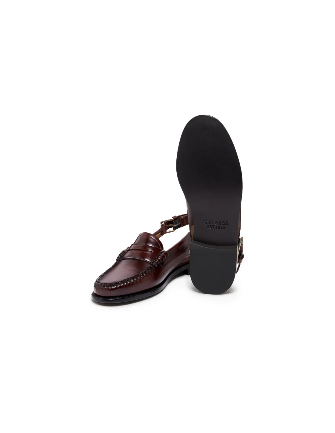 Discover the Weejuns women's penny loafers with a backstrap. Crafted from polished black leather, they feature an adjustable buckle strap for a secure and elegant fit. Perfect for both casual outings and special occasions, these lightweight loafers offer all-day comfort thanks to their cushioned insole. Their robust construction, with a durable welt and a non-slip rubber heel counter, ensures long-lasting wear and will make them a wardrobe staple for years to come. Wear them with tailored trousers or a flowing skirt for a chic, contemporary look.