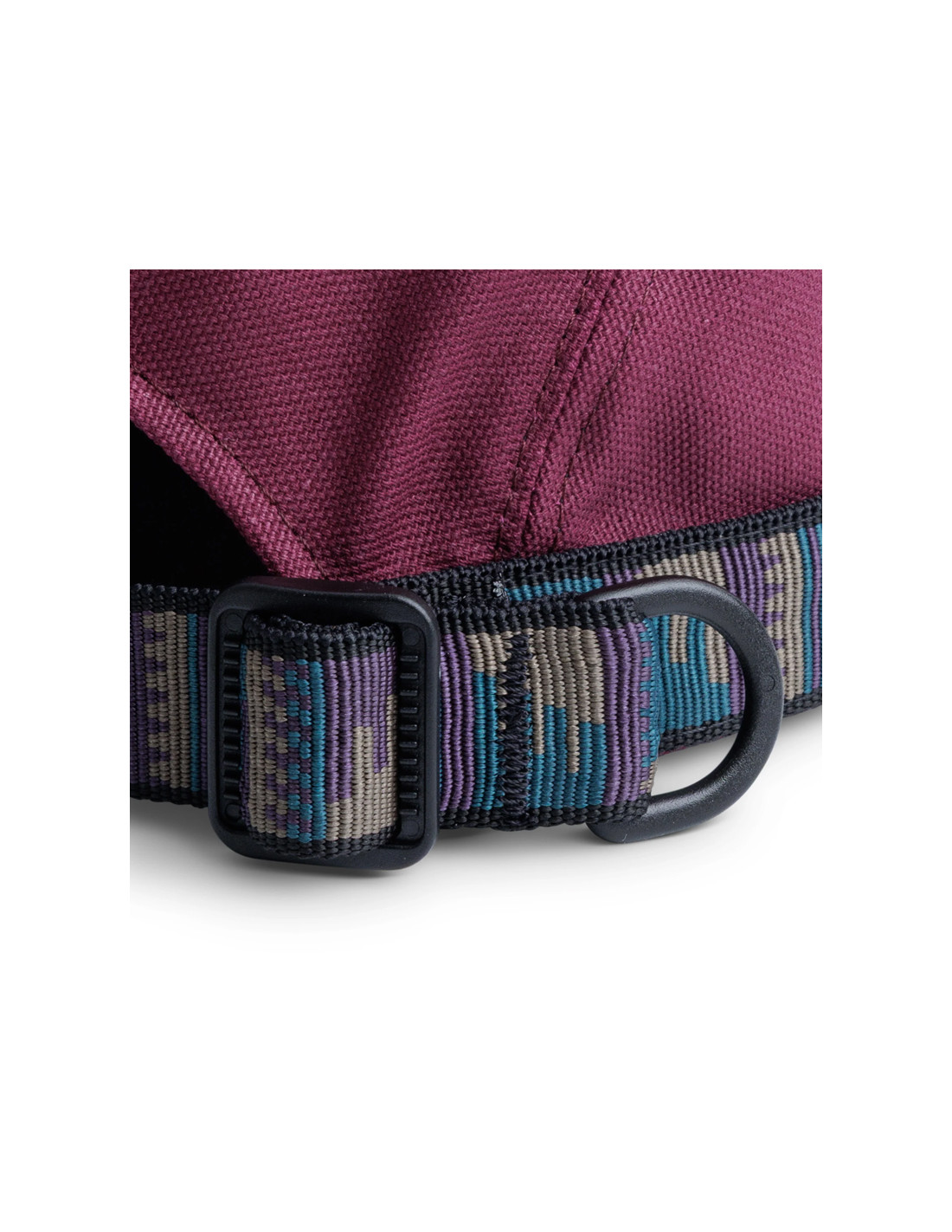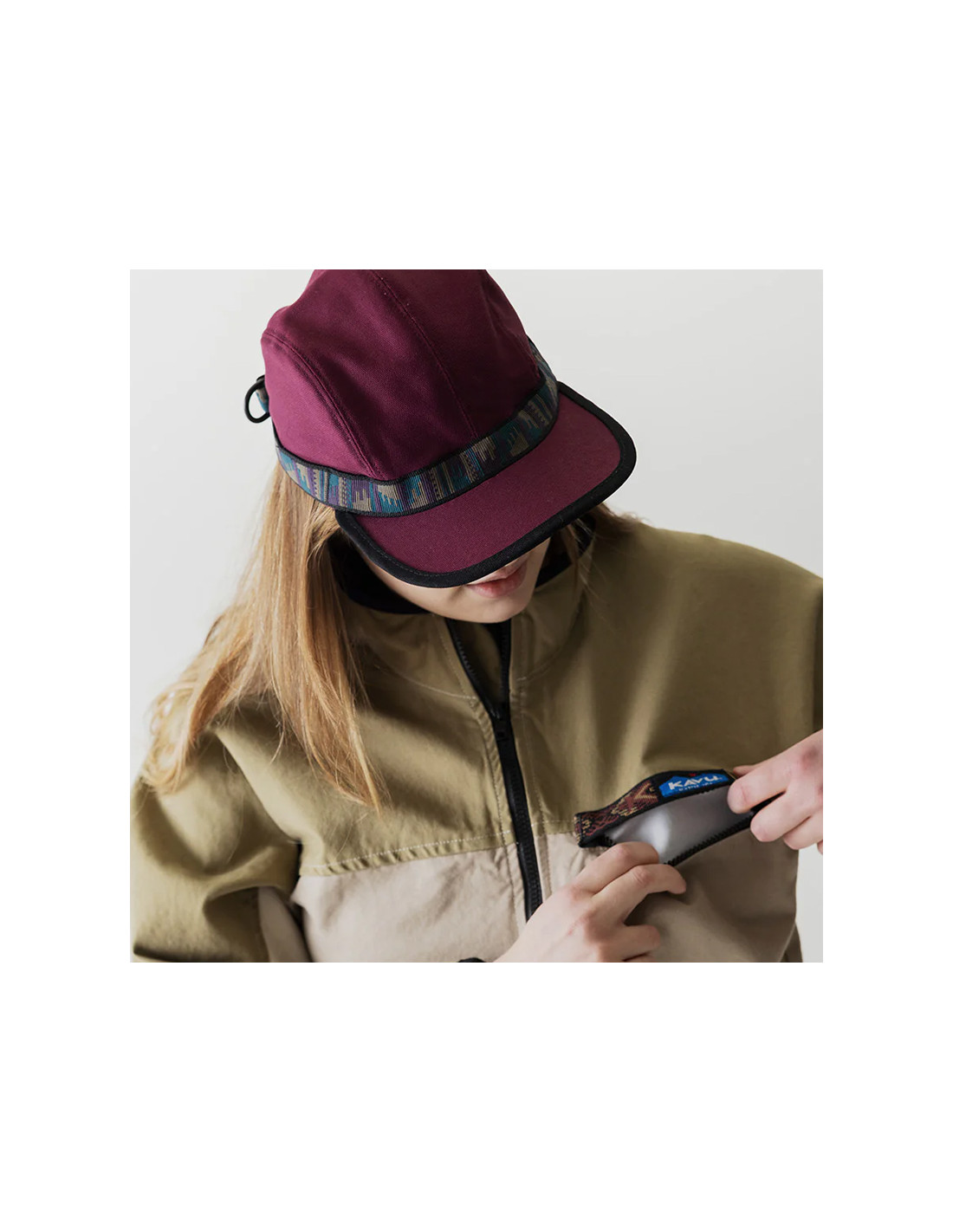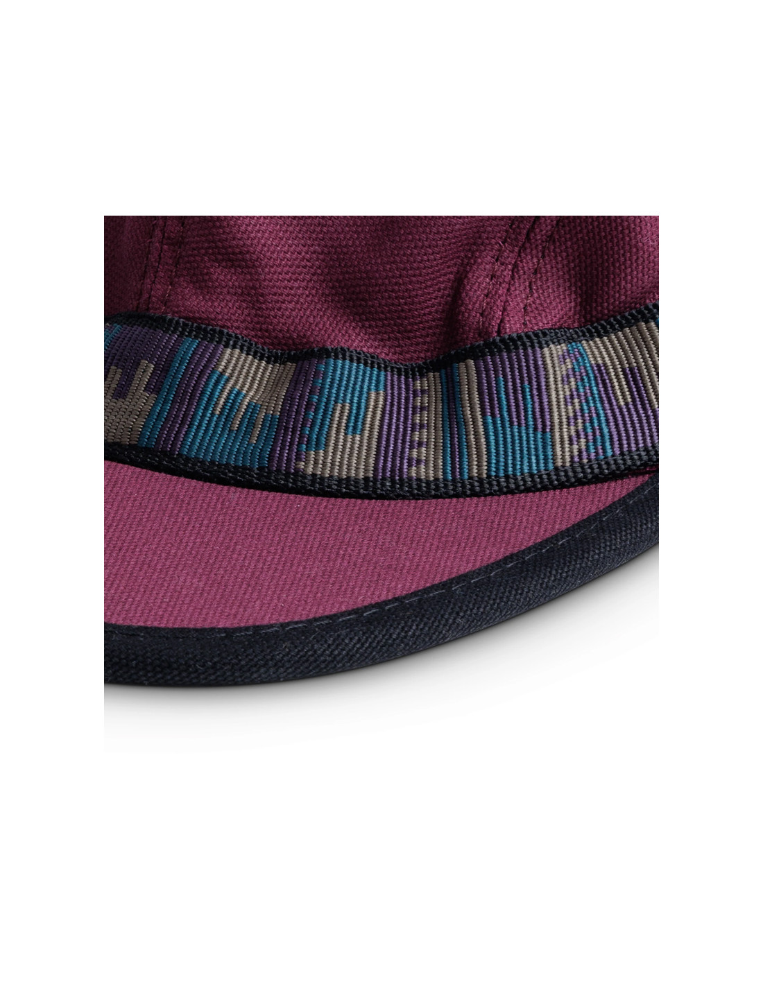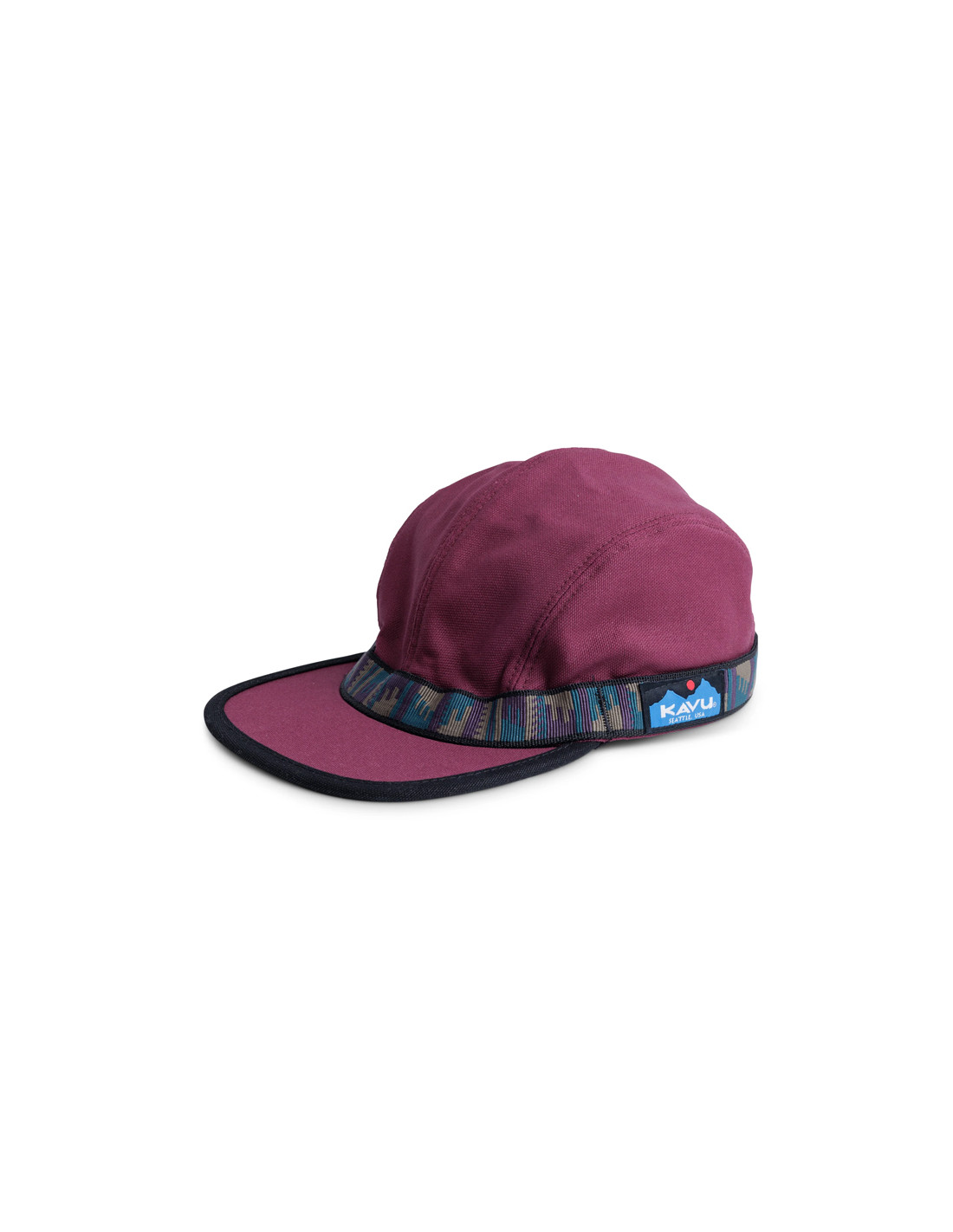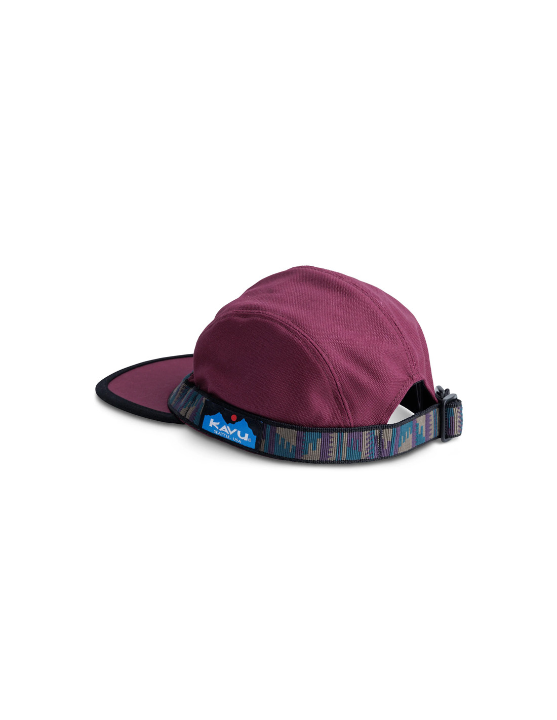 4-panel cap, slightly curved brim, black undervisor, patterned tubular nylon webbing with KAVU adjustment.