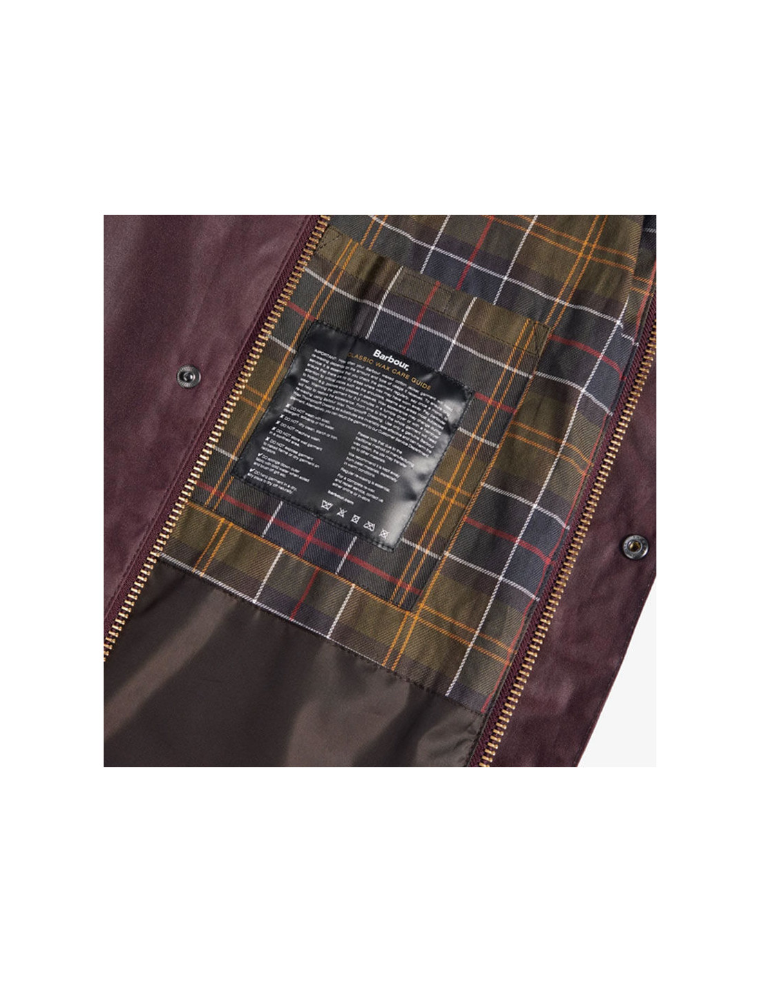 Les éléments classiques d'une veste Barbour sont tous inclus, avec une fermeture à glissière bidirectionnelle en laiton, deux grandes poches à soufflet et deux poches chauffe-mains doublées de moleskine, et le col traditionnel en velours côtelé avec rabat sur la gorge.
