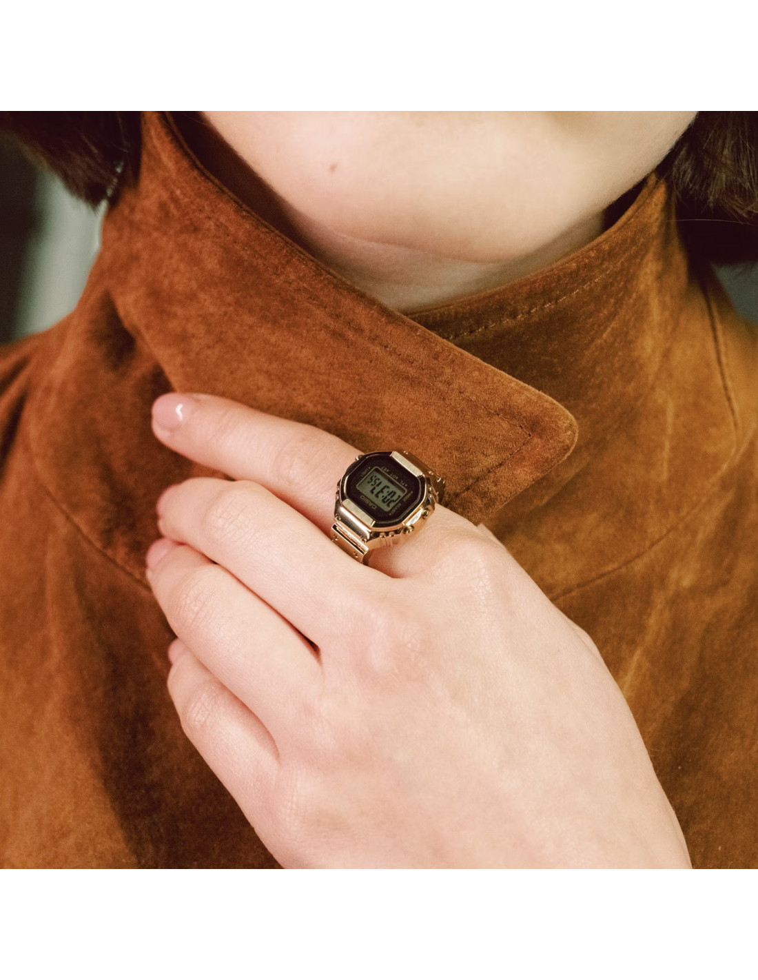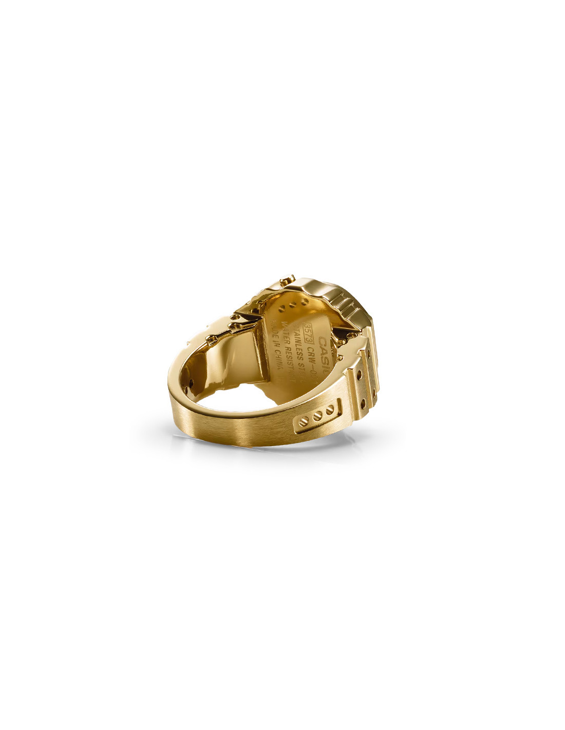 Créer une montre-bague reprenant le design et les fonctionnalités complexes de la montre Casio n'a pas été une mince affaire. Pour ce faire, nous avons dû utiliser le moulage par injection de métal (MIM) afin de reproduire avec précision les détails les plus fins dans l'acier inoxydable. Pour les finitions, nous avons utilisé un placage ionique doré afin que le revêtement de la bague soit lisse et brillant.