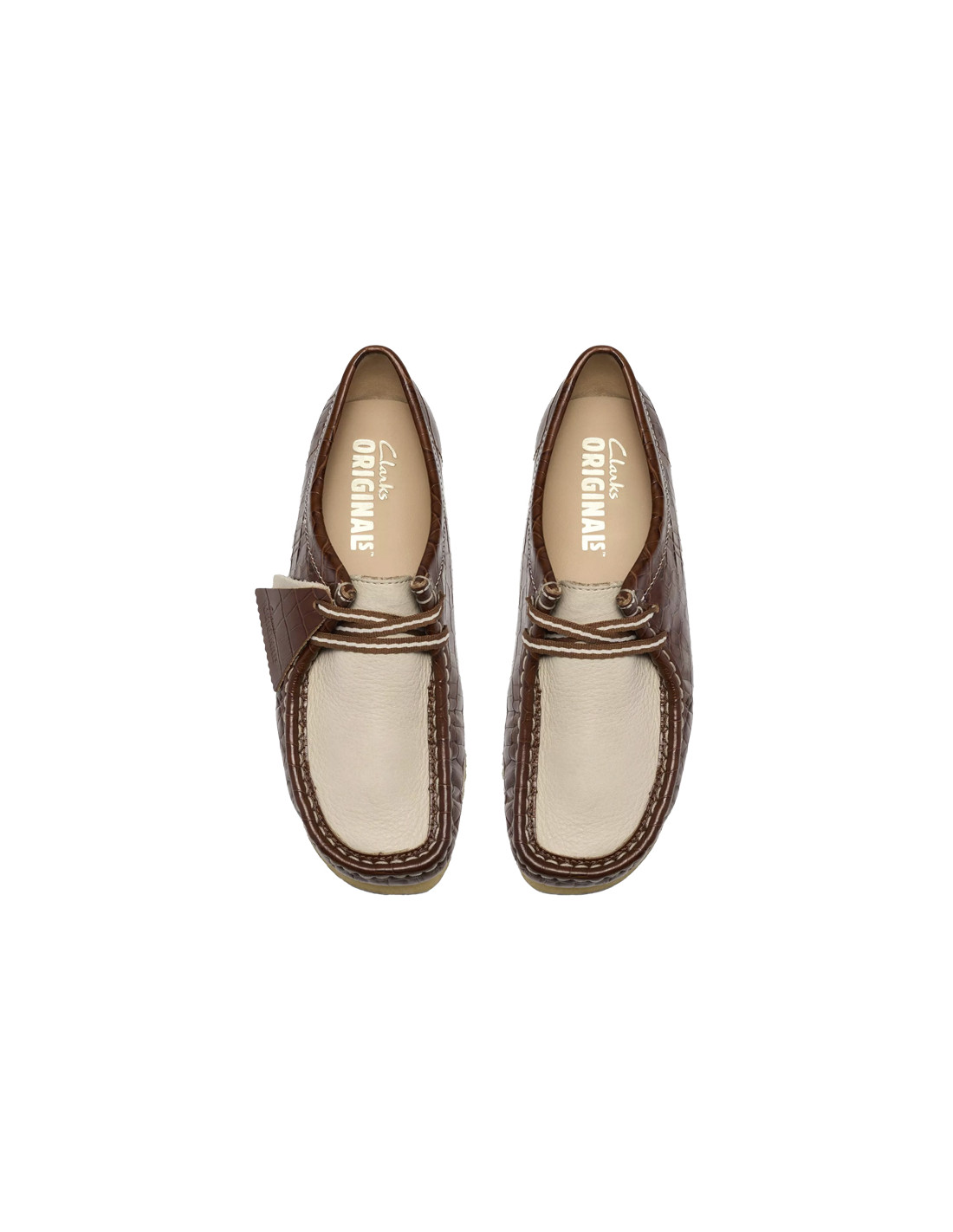 Mocassins en cuir croco marron et cuir lisse beige. Lacets et étiquettes Clarks Originals parachèvent le modèle. Jeu de coutures.