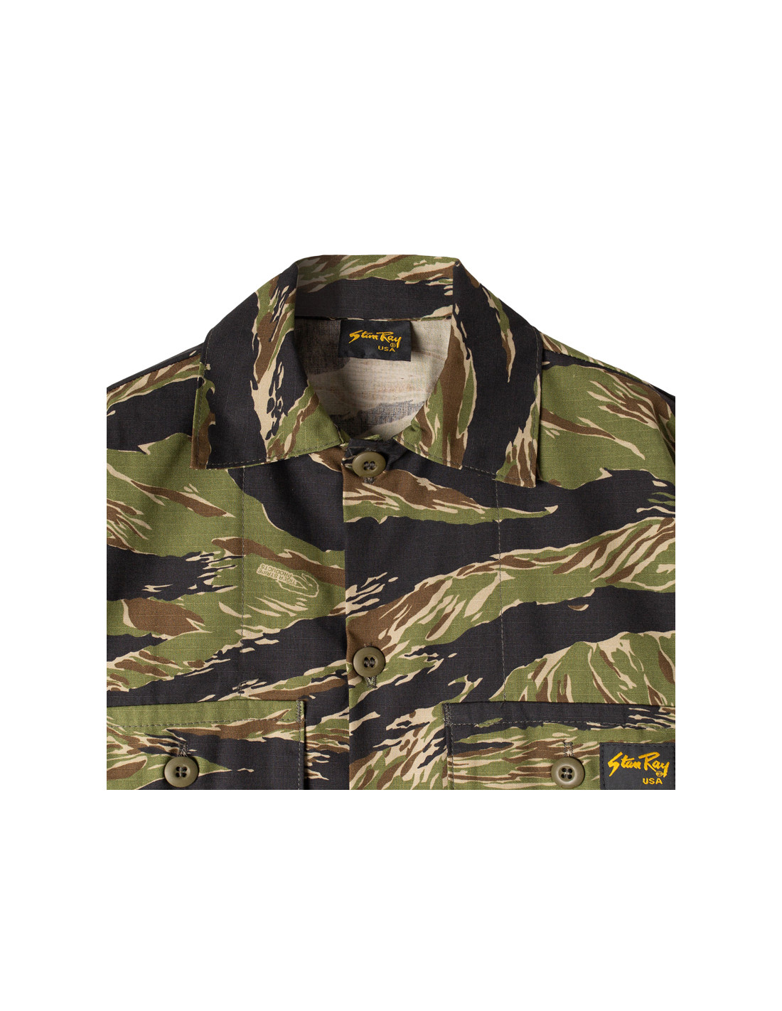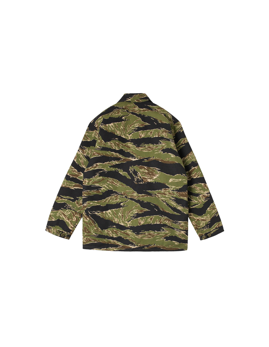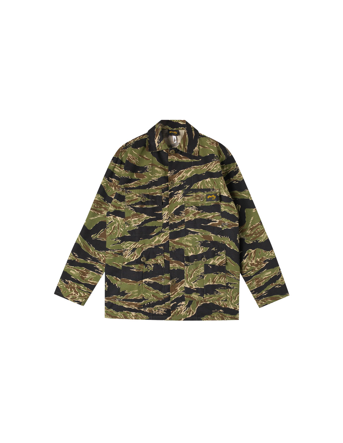 Une veste de travail classique à 4 poches dans un ripstop camouflage Tiger Stripe super résistant et noueux.