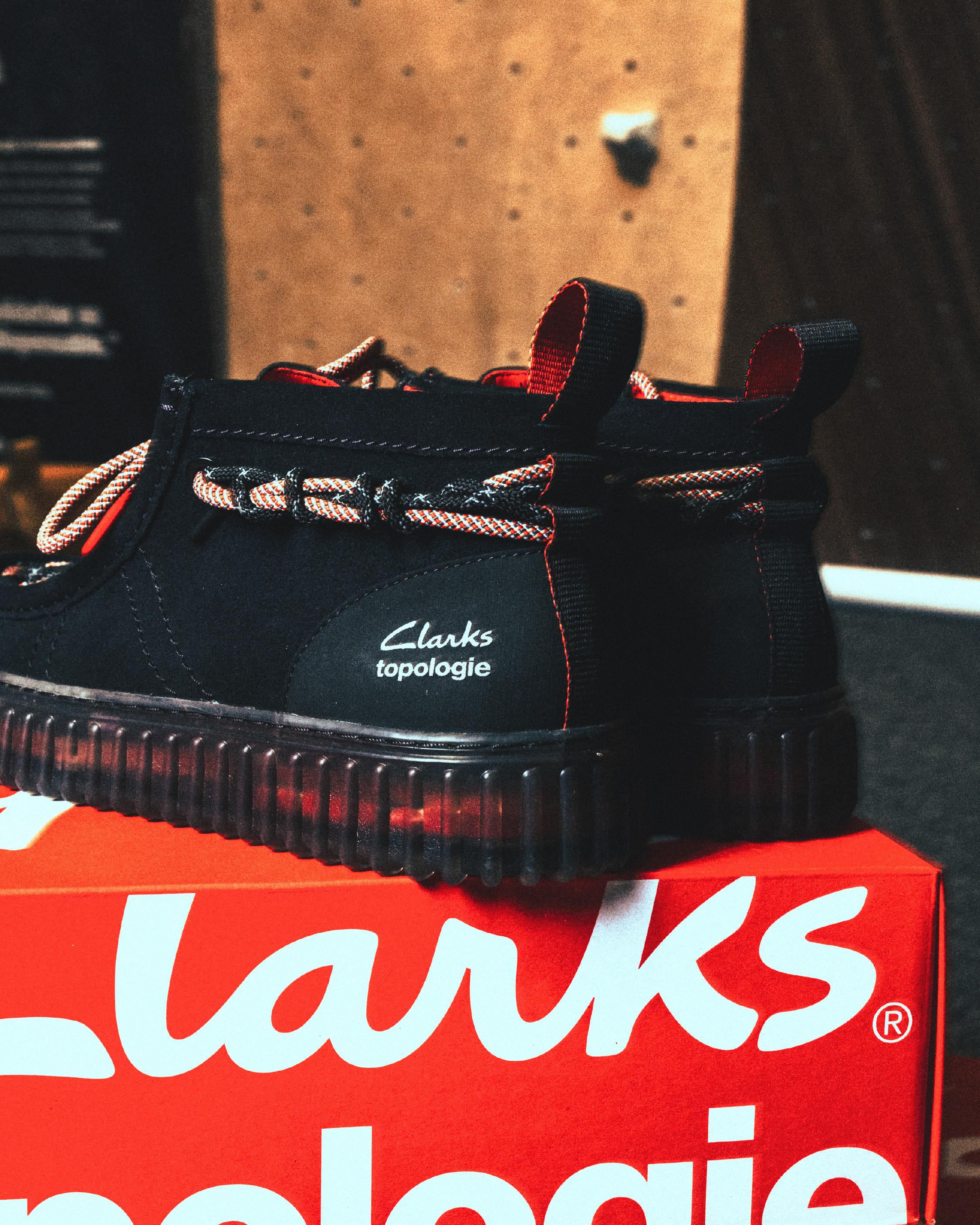 La Topologie x Clarks Torhill Hi allie un design classique avec une silhouette épurée et simple, définie par des courbes douces associées à des détails inspirés de l'escalade. La semelle Torhill emblématique fait référence aux archives de Clarks, tandis que les finitions uniques telles que des lacets inspirés de la randonnée, des tirettes au talon ou encore un mousqueton co-brandé illustrent l'influence du design de Topologie. Des fobs co-brandés complètent la paire, alliant l'artisanat traditionnel au style utilitaire moderne.